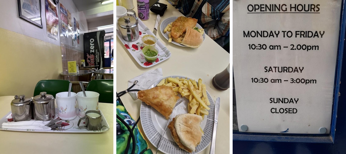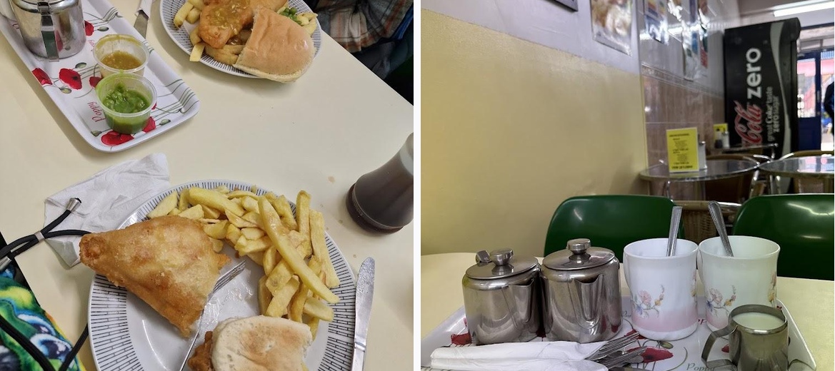 Fantastic traditional fish and chips cafe right outside the market in Huddersfield. Brilliant meal deals which are cooked to order so super fresh and crispy batter and the portions are amazing. We got fish and chips, fish butty and chips, peas, curry sauce, can o pop and a coffee for less than £15