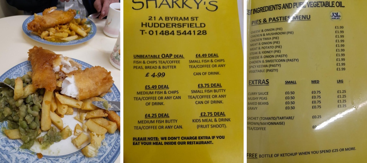 I recently went in n had fish cakes chips and curry sauce. Best chippy food I've had in years. I got them to cook me 6 more fishcakes to take home for me n my better half and she loved them too. Amazing food. Lovely staff and it's a great atmosphere in the restaurant to enjoy a quiet meal. Also the prices are very reasonable. This place is the best in Huddersfield at what it does. Highly recommend 😁